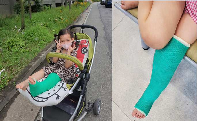 병원 상황:일요일이라 그런지 의사 선생님이 많이 없으셔서 대기는 30분정도 하였다. 우선 X-RAY 촬영을 하고 의사선생님이 아무래도 부러진 것 같다고 CT촬영을 요청하여 찍고나서 확인을 하니 아니길 바랬지만 가로로 선명하게 부러진 뼈의 모습을 보고 말았다. 의사선생님이 처음에는 성장판 상처 유무도 확인해야 되고 최악은 철심도 박아야 된다고 해서 좌절하고 있었는데 다행히 그 상황까지는 아니라고 깁스를 3주는 해야 된다고 하시더라. 그래도 다행히 둘째가 병원에 오니 씩씩하게 울지도 않고 잘 받아줘서 너무 고마운 상황이었다.